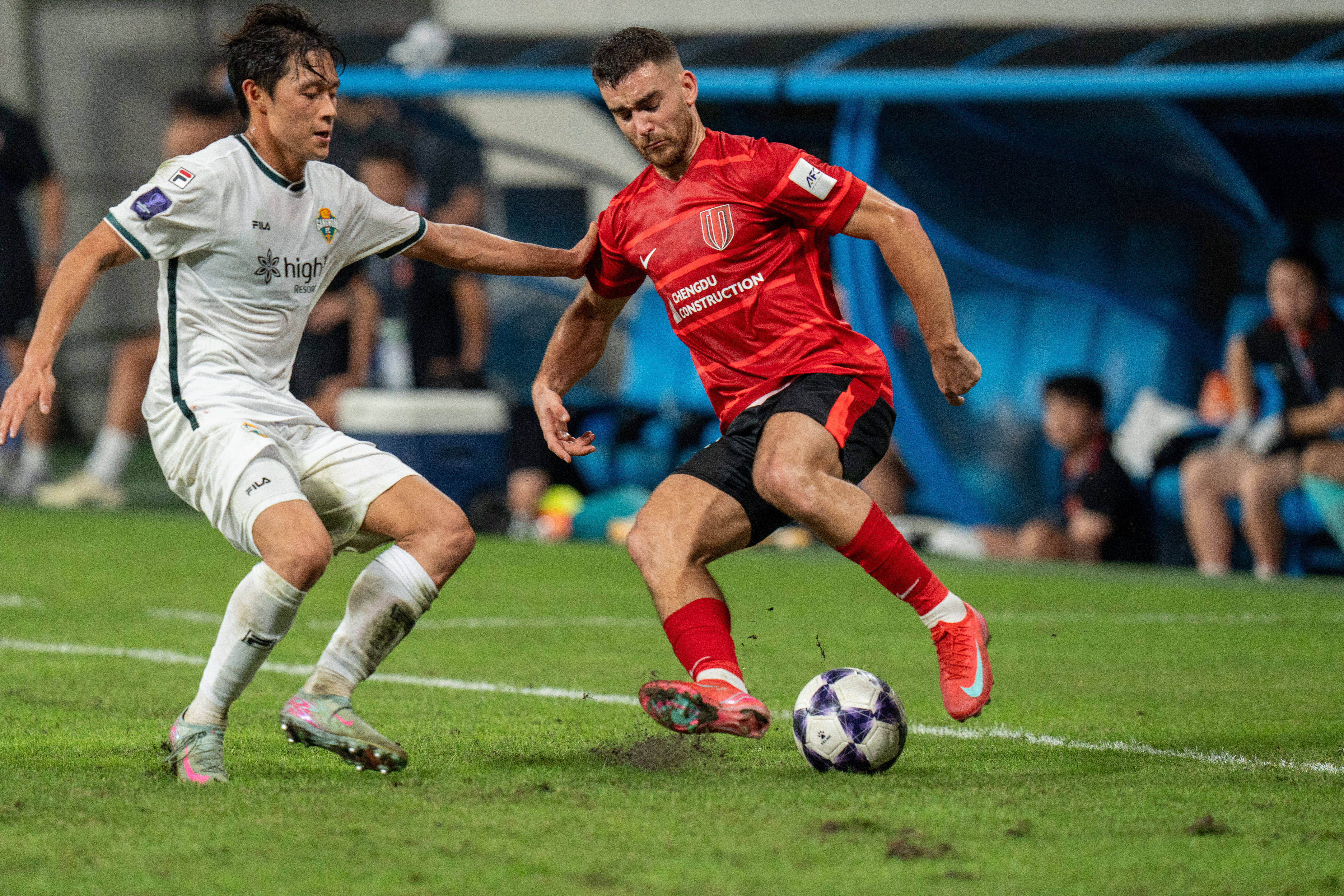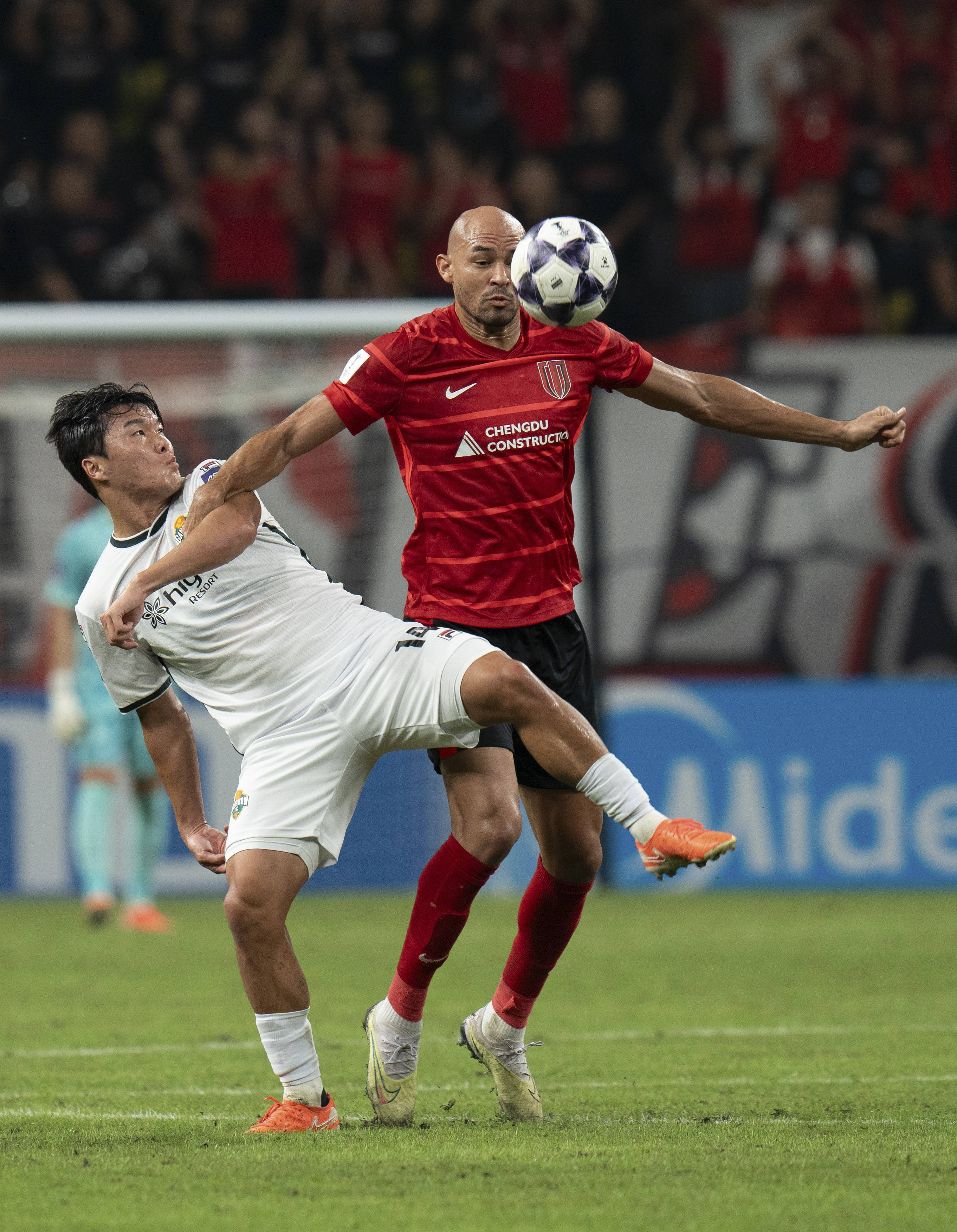 9月30日,成都蓉城队球员费利佩(右)与韩国江原FC队球员金大宇拼抢。 新华社记者 薛晨 摄